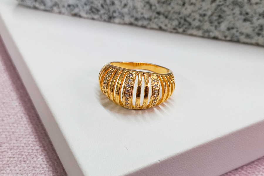 ANEL BANHADO EM OURO, APARADOR DUPLO, COM 2 FILEIRAS DE ZIRCÔNIAS CADA