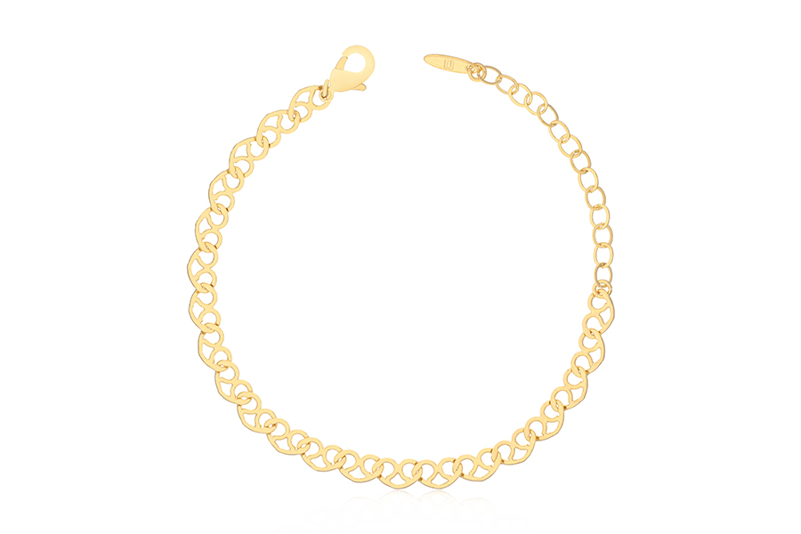 TORNOZELEIRA BANHADA EM OURO, CORRENTE ELO CORAÇÃO 5,40mm LARGURA, 23cm COMPRIMENTO E EXTENSOR 5cm