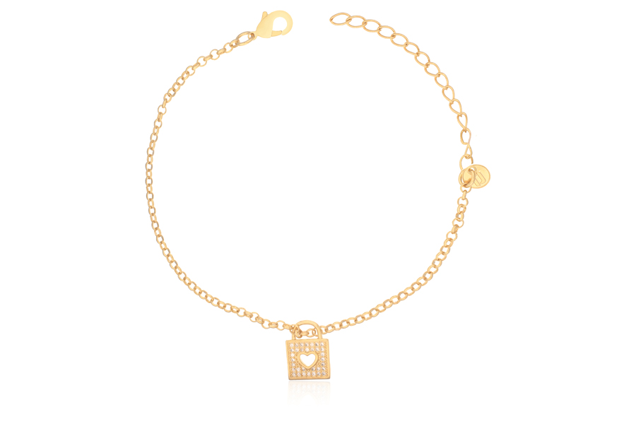 PULSEIRA BANHADA EM OURO, ELO PORTUGUÊS 3mm, ELO CORAÇÃO 4,20mm LARGURA, PINGENTE CORAÇÃO 11mm LARGURA COM MENINA