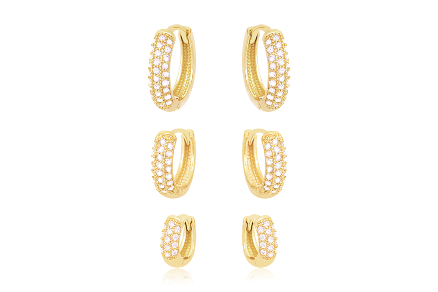 CONJUNTO BANHADO EM OURO, TRIO DE ARGOLINHAS 10mm E 13 ZIRCÔNIAS, 12mm E 22 ZIRCÔNIAS, 15mm E 28 ZIRCÔNIAS