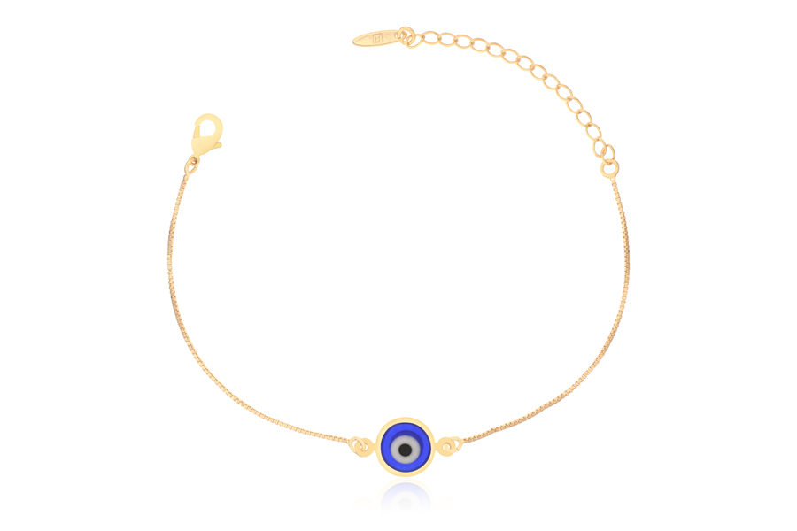 PULSEIRA BANHADA EM OURO, ELO VENEZIANA 0,80mm, 16cm COMPRIMENTO, EXTENSOR 5cm, OLHO GREGO 11mm DIÂMETRO, QUALQUER COR, LINHA TRADICIONAL