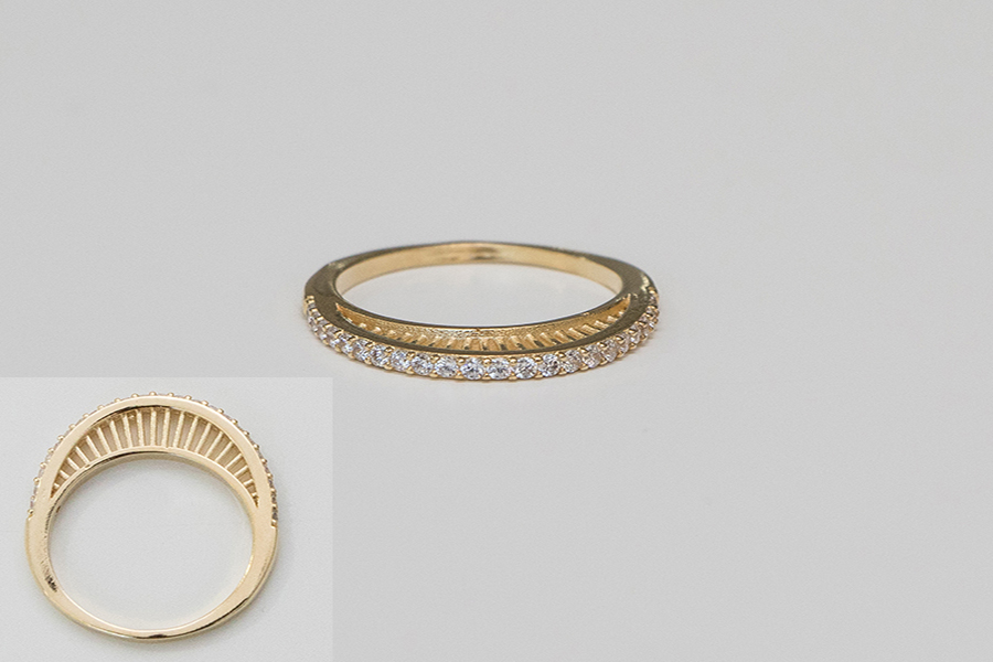 ANEL BANHADO EM OURO, APARADOR DUPLO, COM 2 FILEIRAS DE ZIRCÔNIAS CADA