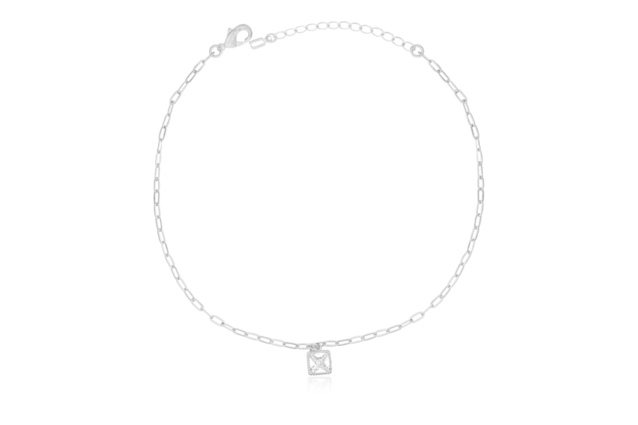 TORNOZELEIRA BANHADA EM PRATA LEVE, ELO CARTIER 4,10x1,90mm, 22cm COMPRIMENTO, EXTENSOR 5cm E ZIRCÔNIA QUADRADA 6mm